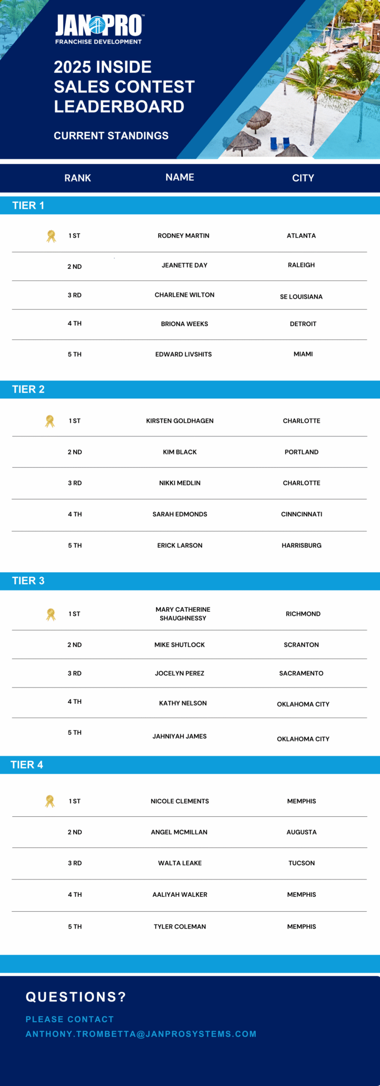 Your dedication to driving results is the backbone of our success. Each quarter, we reward the top 12 inside sales performers (3 per tier) who excel in: